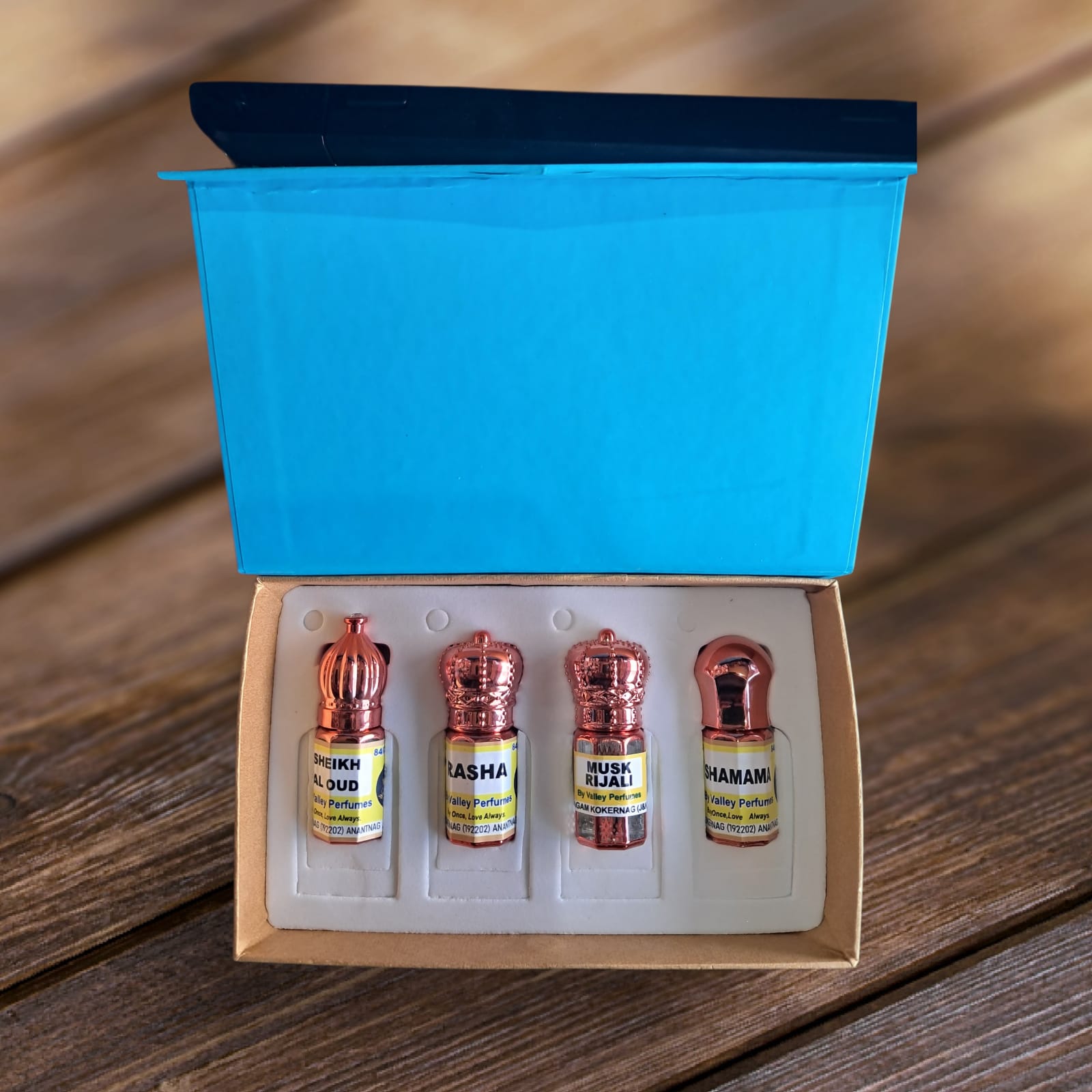 Combo Pack of 4 Flavours (3ml Each) by Valley Perfumes – a premium quality selection featuring Sheikh Al Oud, Rasha, Musk Rijali, and Shamama. These classic oriental attars offer rich, deep and long-lasting fragrances, perfect for those who appreciate traditional and luxurious scents. ✨🌿