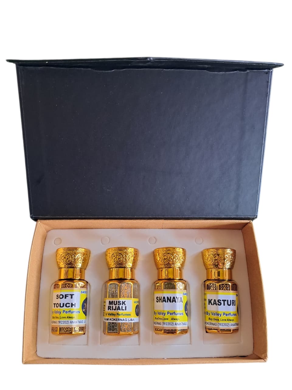 Combo Pack of 4 Flavours (6ml Each) by Valley Perfumes – a premium quality selection featuring Soft Touch, Musk Rijali, Shanaya, and Kasturi. This combo offers a beautiful blend of soft, musky, and classic fragrances with a long-lasting aroma, perfect for daily wear and special occasions. ✨🌿