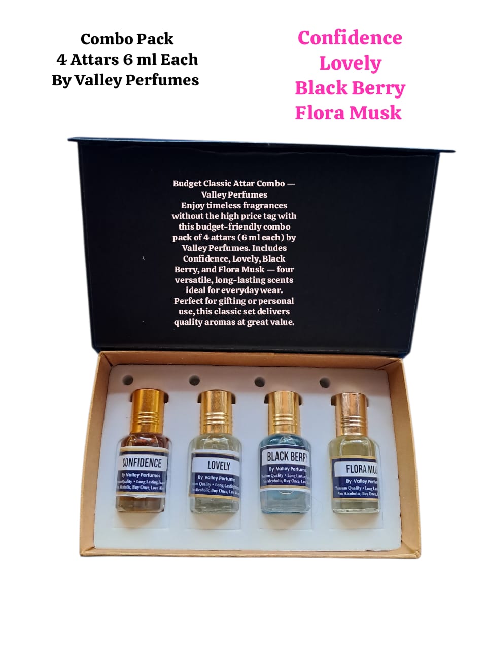 Enjoy timeless fragrances without the high price tag with this budget-friendly combo pack of 4 attars (6 ml each) by Valley Perfumes. Includes Confidence, Lovely, Black Berry, and Flora Musk — four versatile, long-lasting scents ideal for everyday wear. Perfect for gifting or personal use, this classic set delivers quality aromas at great value.