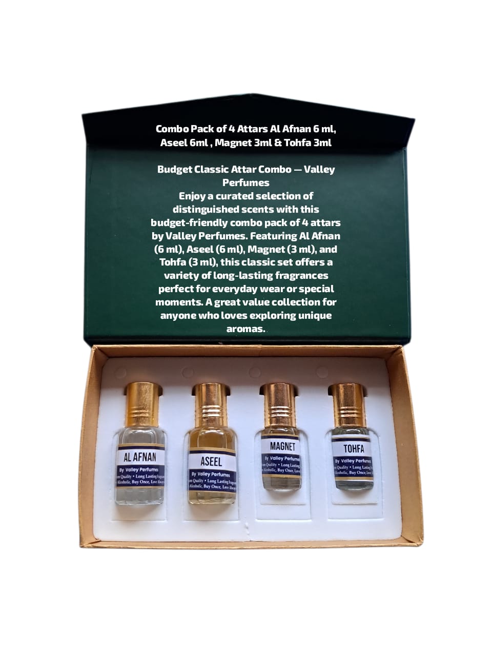Enjoy a curated selection of distinguished scents with this budget-friendly combo pack of 4 attars by Valley Perfumes. Featuring Al Afnan (6 ml), Aseel (6 ml), Magnet (3 ml), and Tohfa (3 ml), this classic set offers a variety of long-lasting fragrances perfect for everyday wear or special moments. A great value collection for anyone who loves exploring unique aromas.