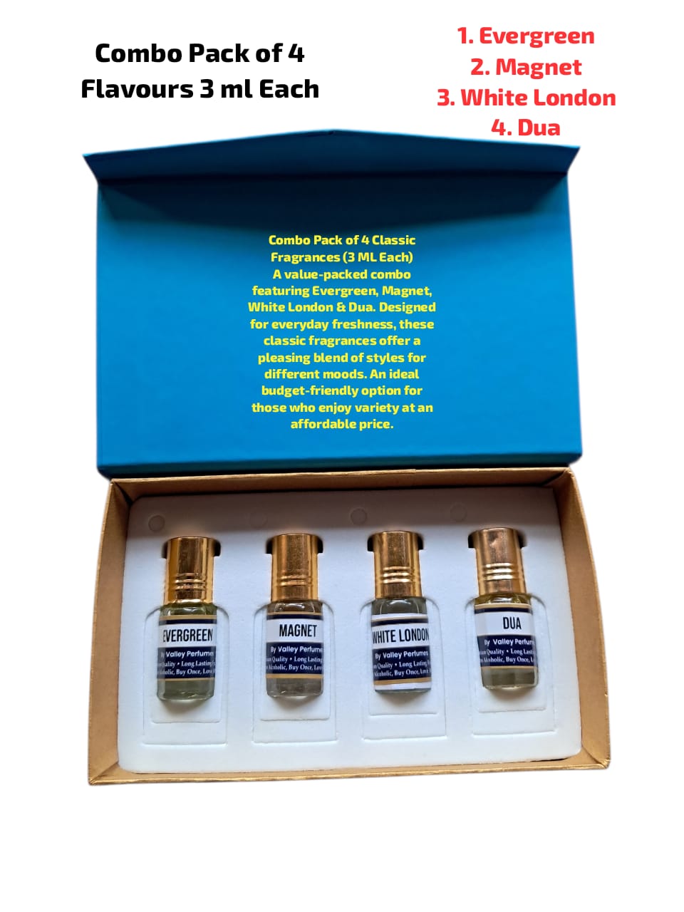 Combo Pack of 4 Flavours 3 ML Each , Evergreen, Magnet, White London & Dua